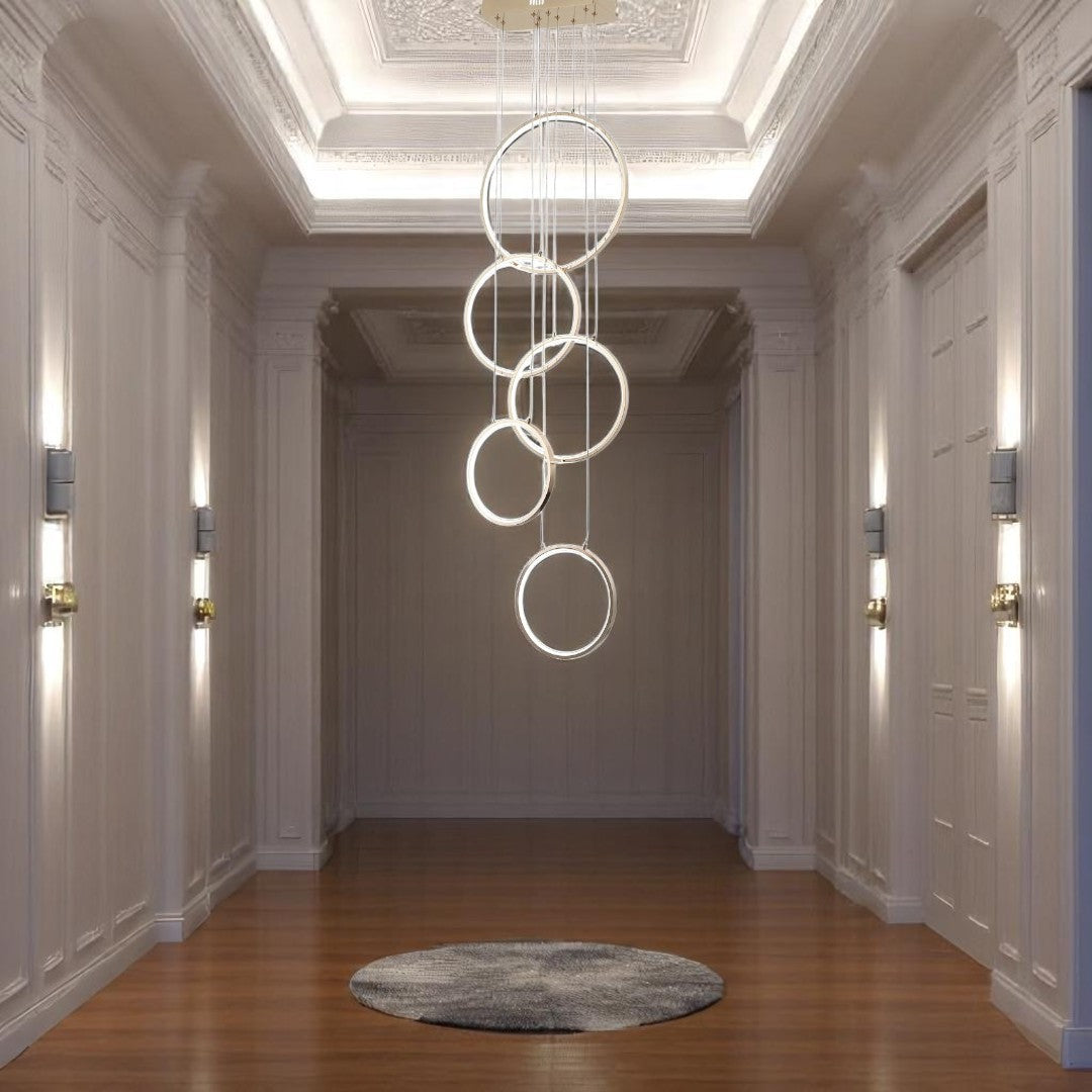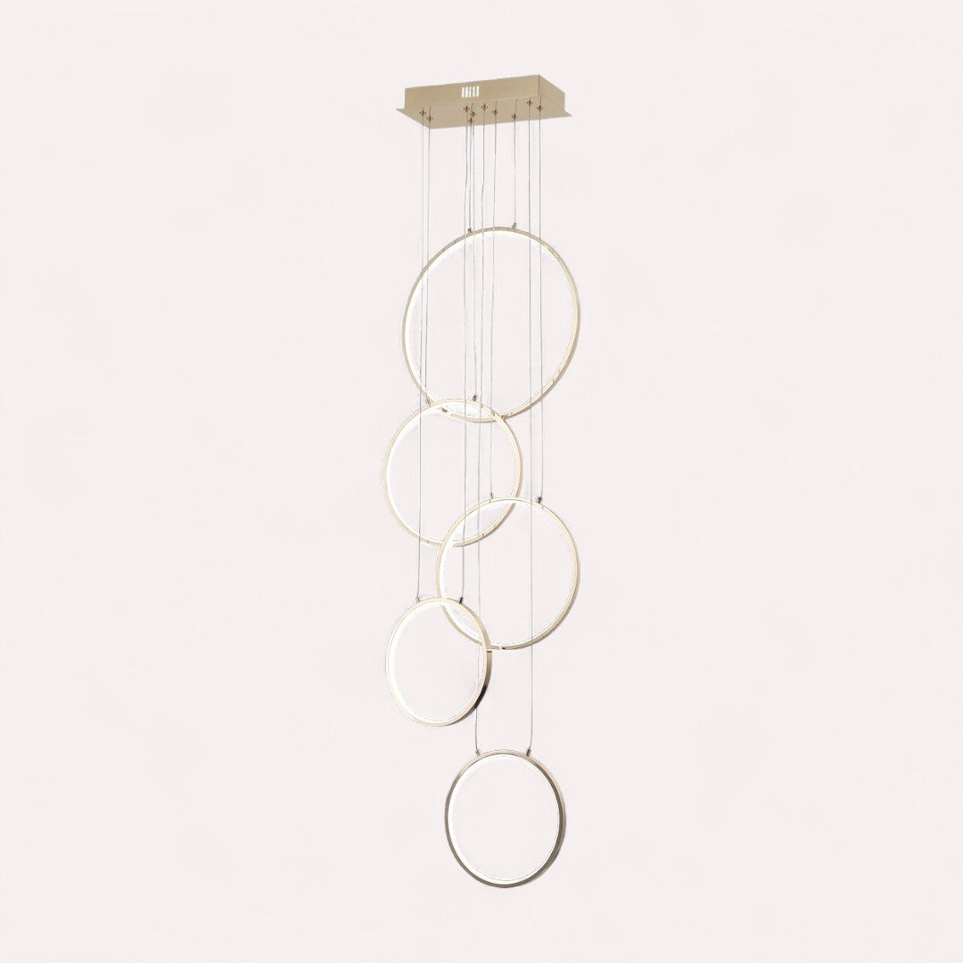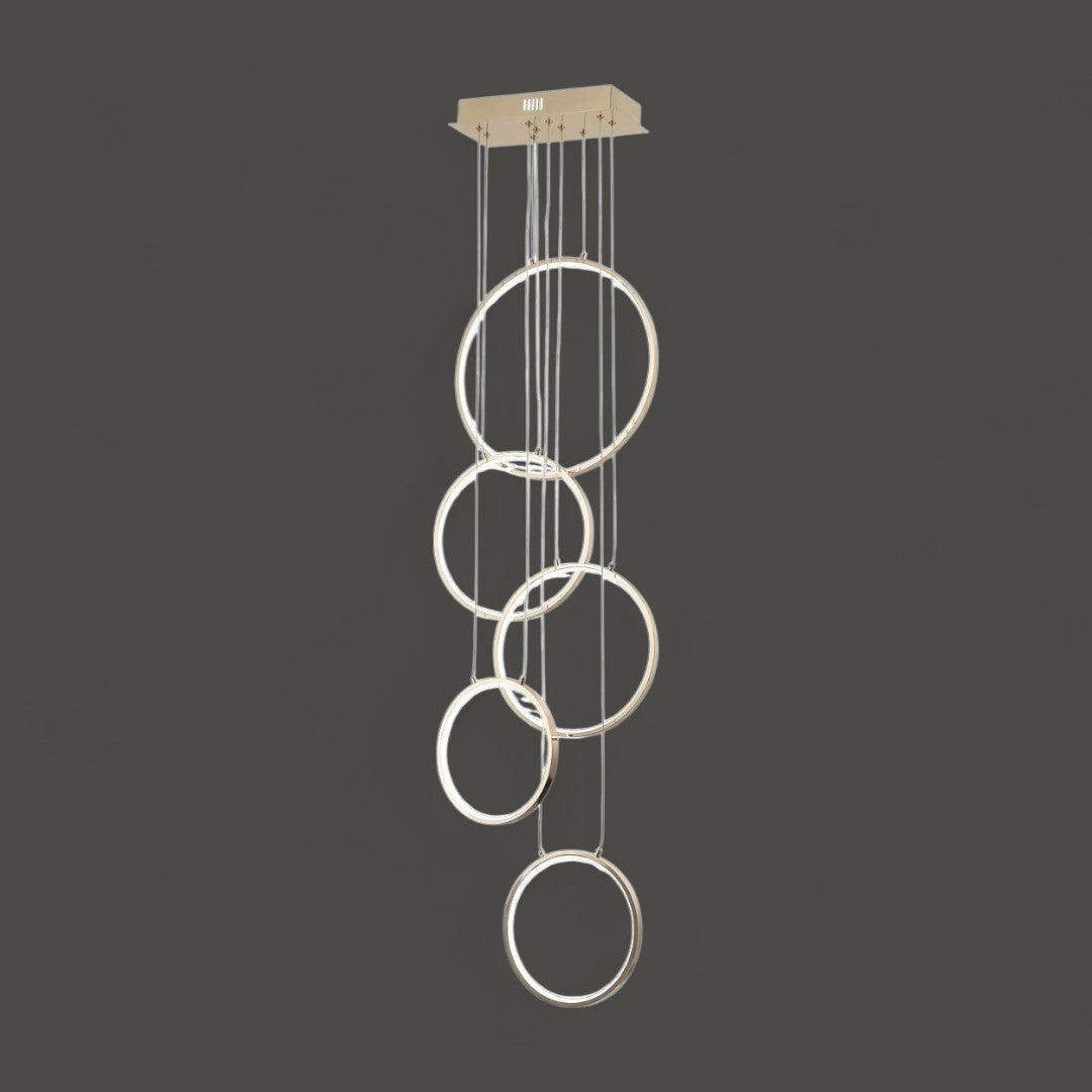 LÁMPARA YANGO-RFG ORO ROSADO ALUMINIO ACRILICO, 5 AROS: 1 DE 30CM, 2 DE 20 CM Y 2 DE 15CM, BASE: DE 30 X 15 CM MEDIDAS: 1.80M