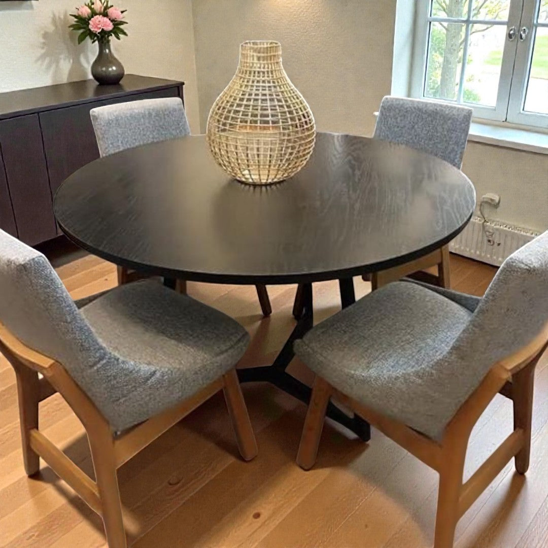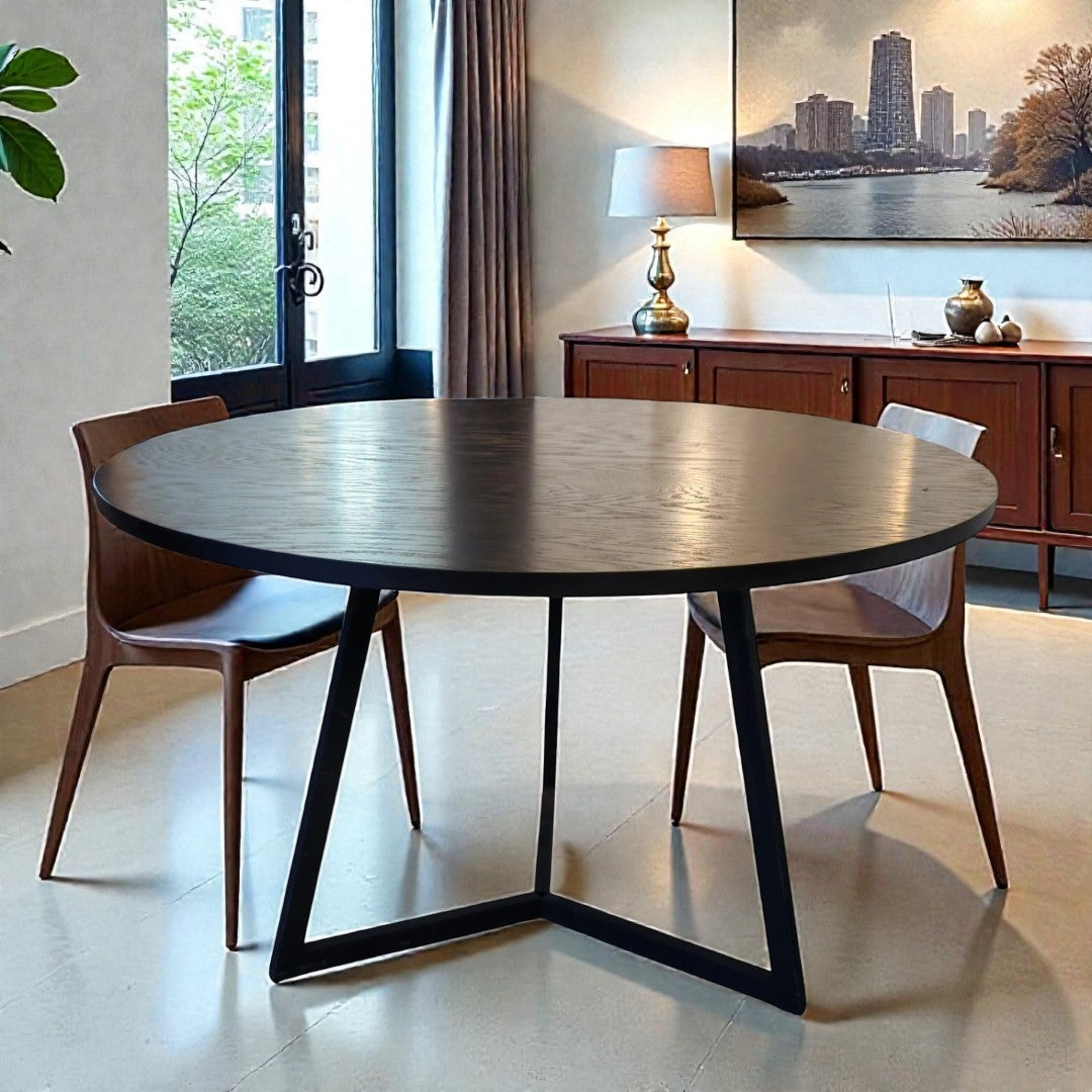 MESA DE COMEDOR VIGO REDONDA CHAPA ENCINO CHOCOLATE PEDESTAL METAL MEDIDAS: 1.20M DIAMETRO